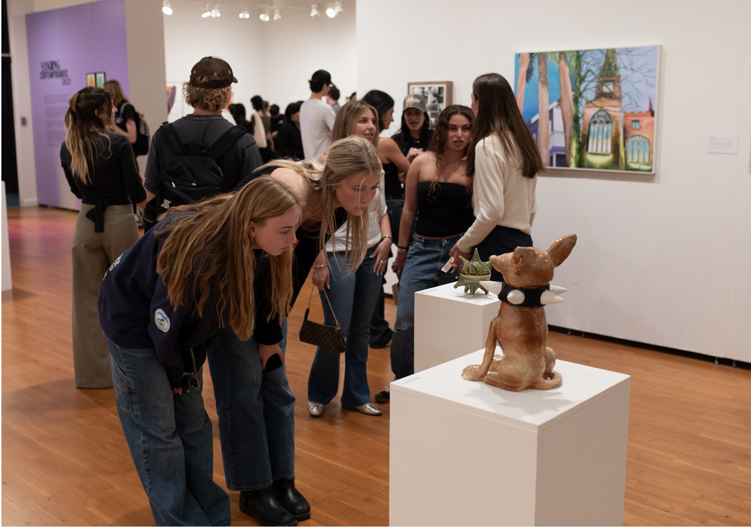 LMU students admire artist Rachel Novak’s ceramic dog at the last year’s juried exhibition, Young Contemporaries 2025.
